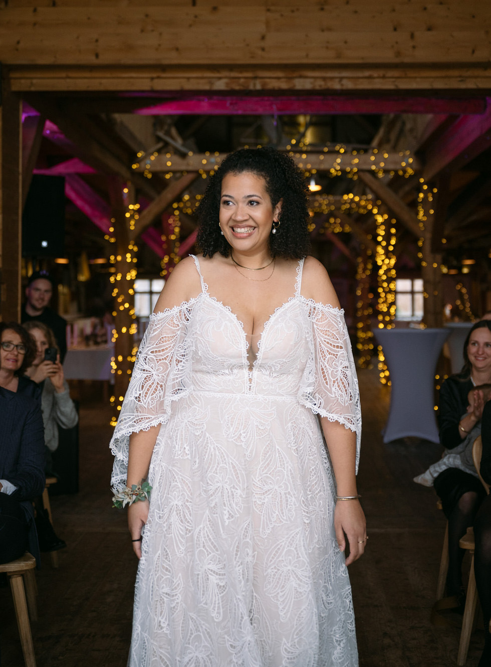 Kyisha hat sich wirklich für eines unserer Traumkleider entschieden. Das Brautkleid von Evie Young ist eine moderne Interpretation von einem Boho-Kleid. Das Kleid ist in einer tollen A-Line geschnitten und schmeichelt der weiblichen Körperform. Eines der Highlights ist die aufwendige und hochwertige Spitze sowie die abnehmbaren Ärmel. Kyisha hat ihr Traumkleid stilvoll mit Boots kombiniert. Wir feiern diesen Look.