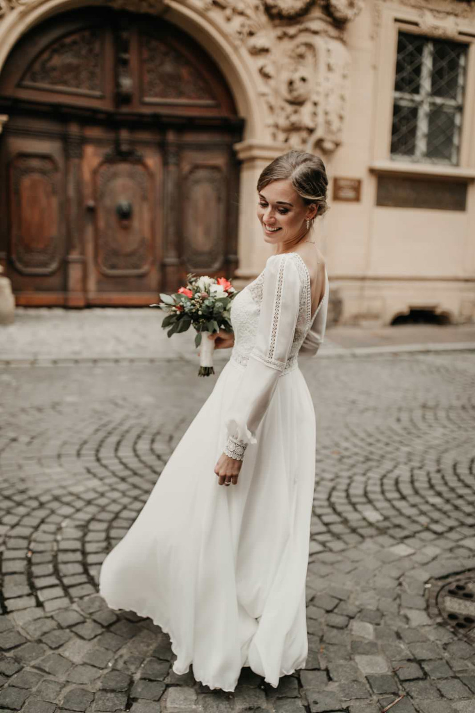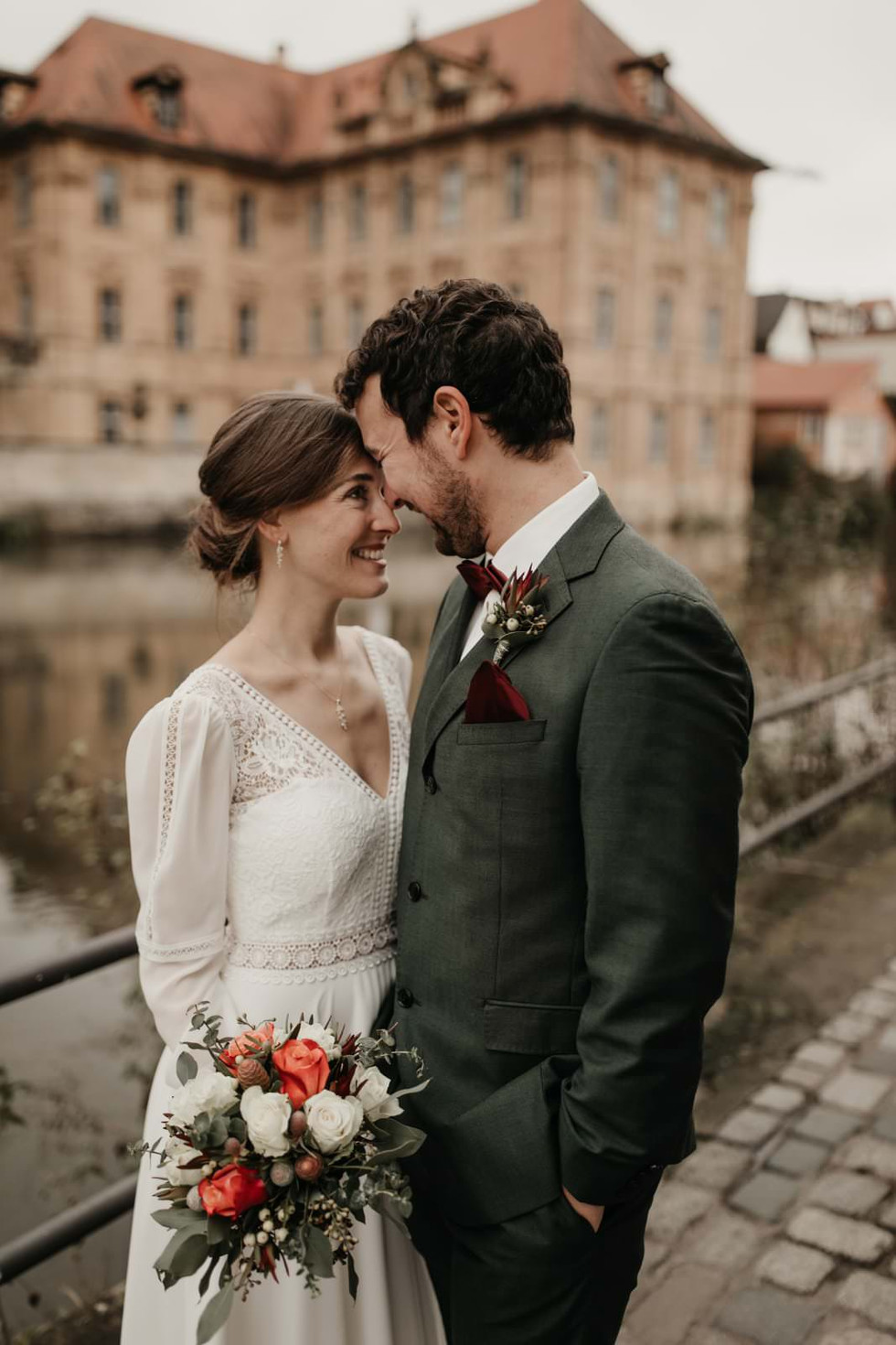 Das winterliche Bamberg, eine bezaubernde Braut, dazu ein passender Strauß Blumen und ein feines langarmiges Brautkleid. Schon hat man einen wunderschönen winterlichen Look. Egal ob du Team kuschlige Winterhochzeit oder warme Summerwedding bist. Bei uns im Store finden wir sicher das richtige Brautkleid für dich.